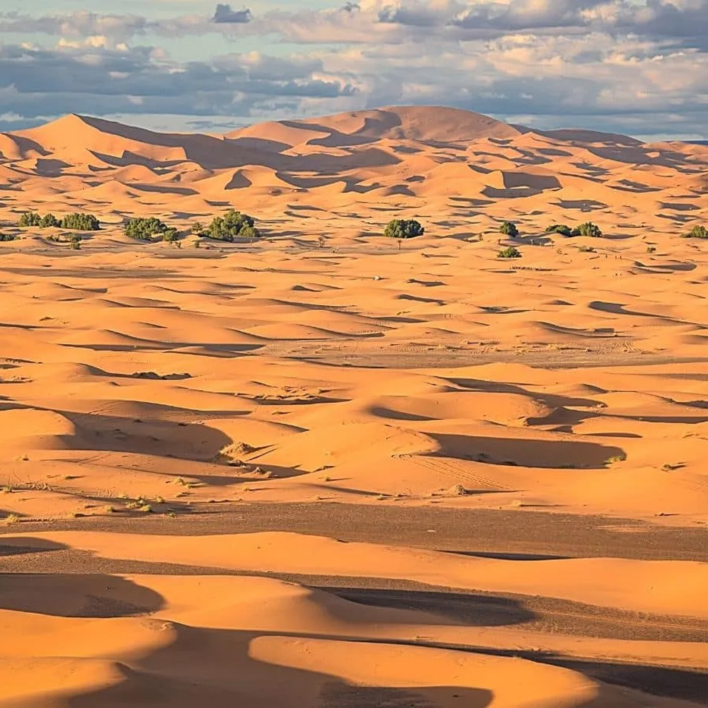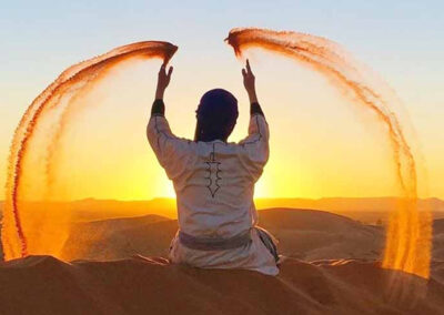 As sunset approaches, you’ll make your way to a high vantage point overlooking the desert. Here, you’ll pause to enjoy a freshly prepared cup of Moroccan mint tea while watching the sun gradually sink below the horizon. The changing colors of the sky, gold, amber, and soft pink, create a magical desert atmosphere and the perfect moment for photography and reflection.